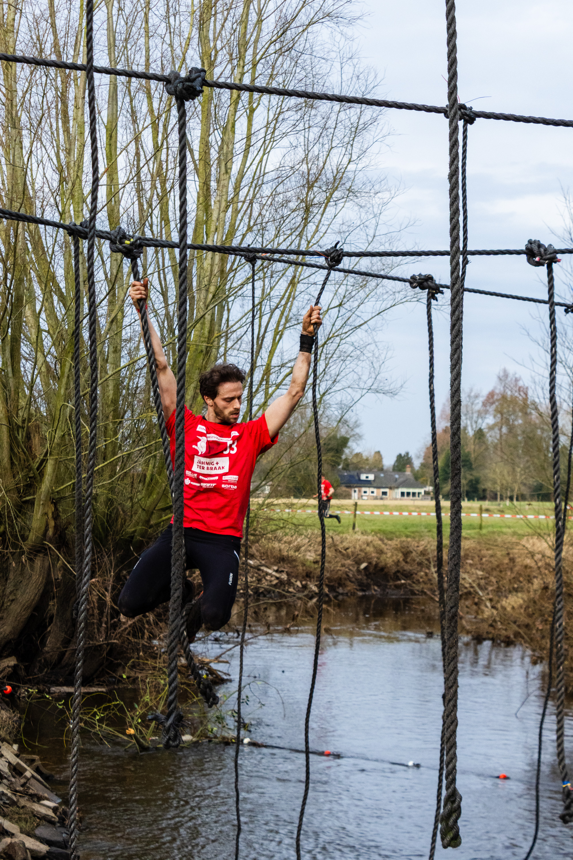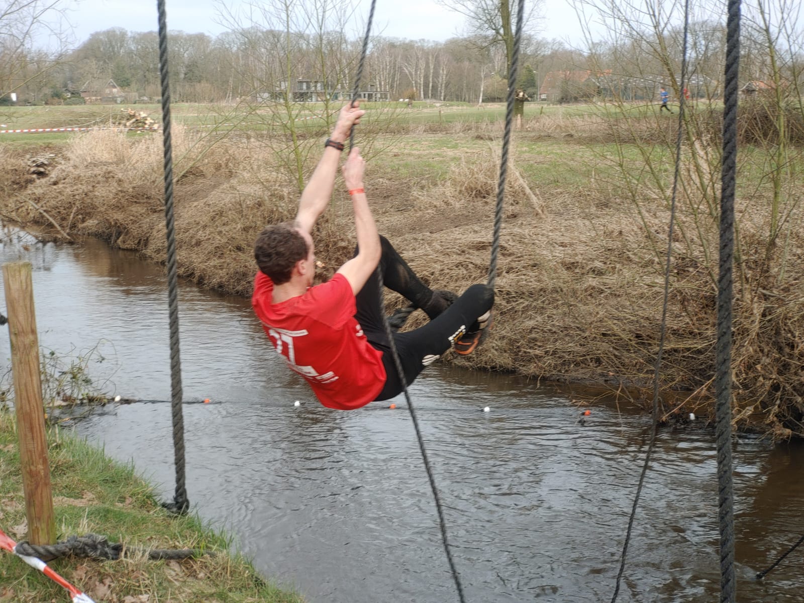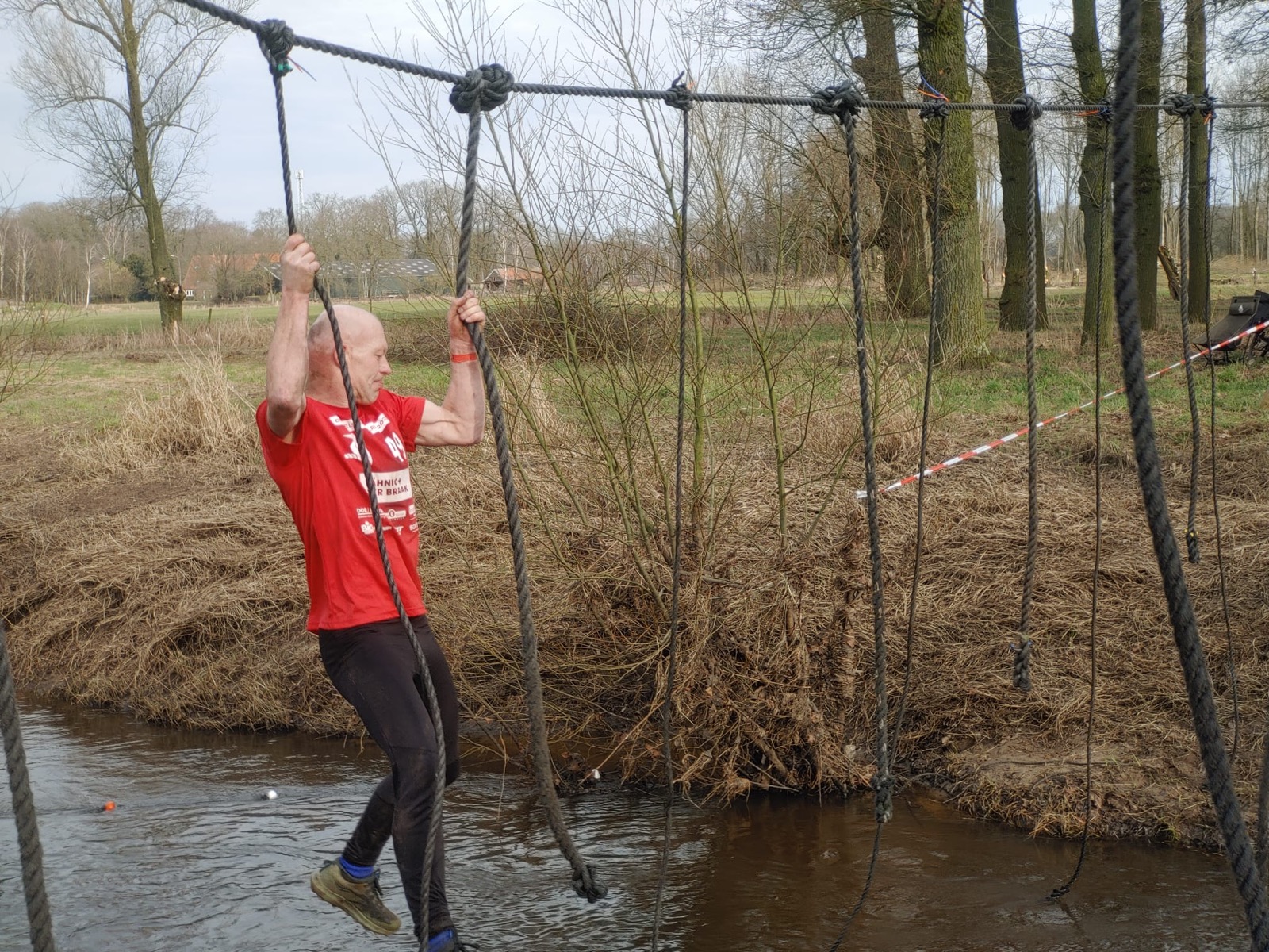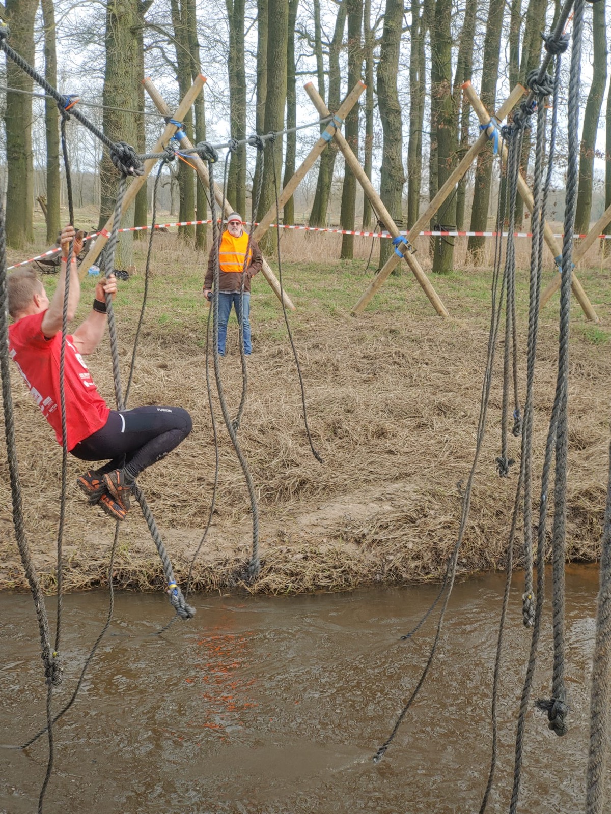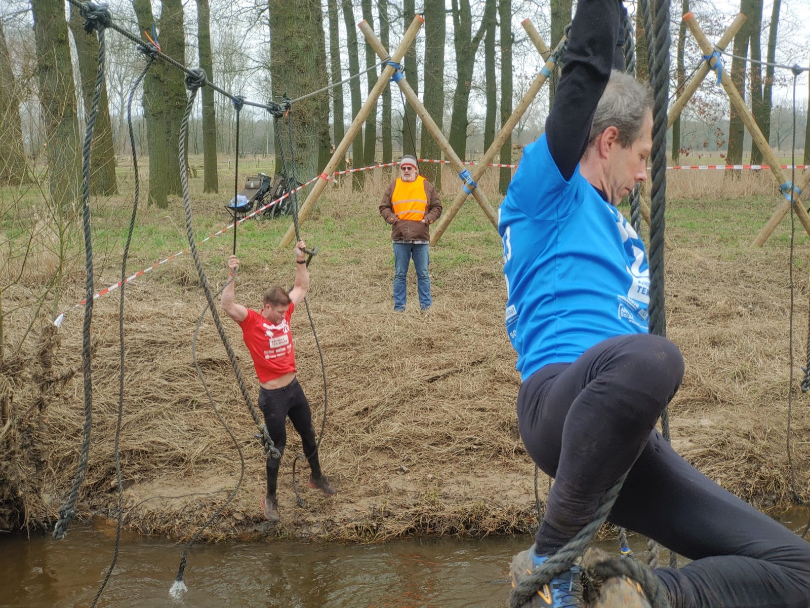 Deelnemers moeten via de lianen naar de overkant van de Dinkel klimmen. Hierbij mogen ze geen gebruik maken van het boventouw.
