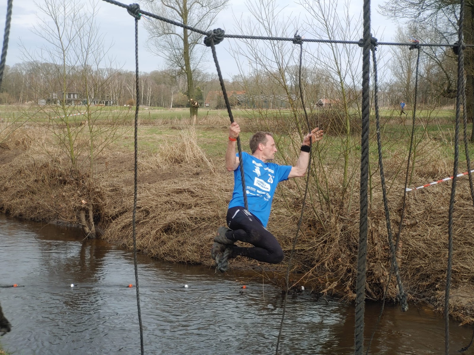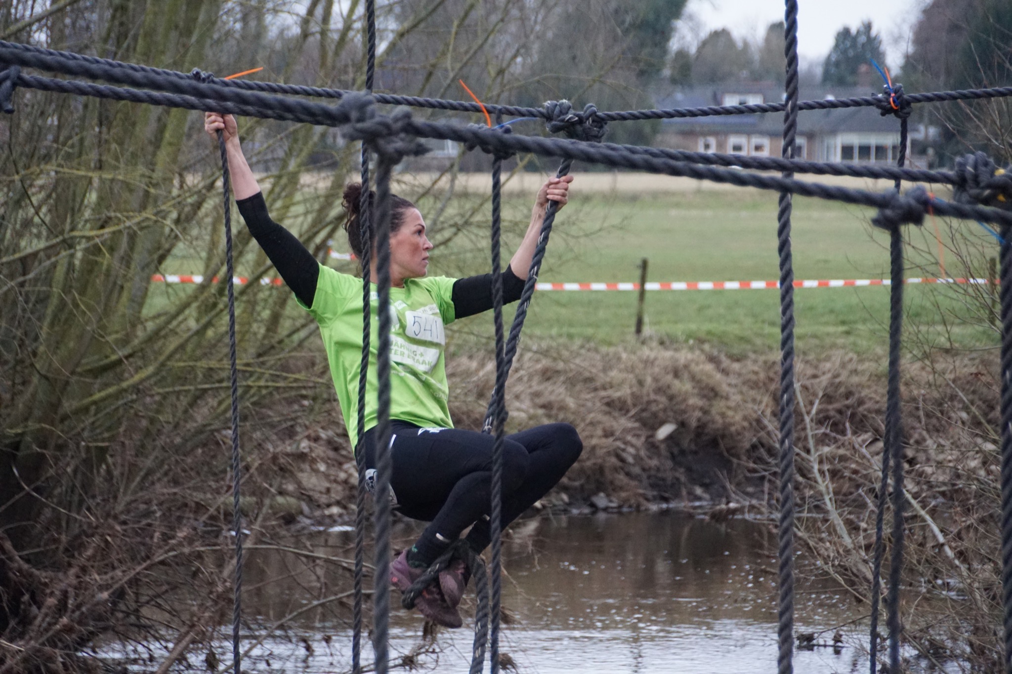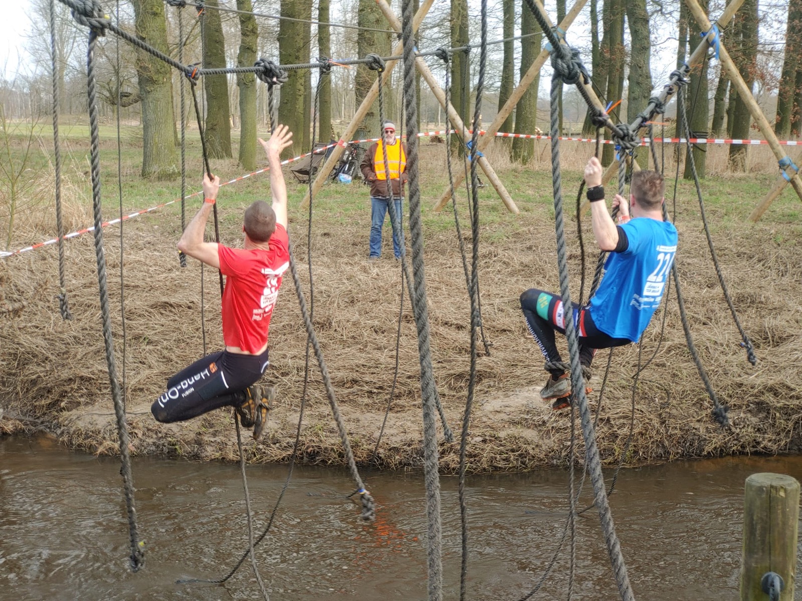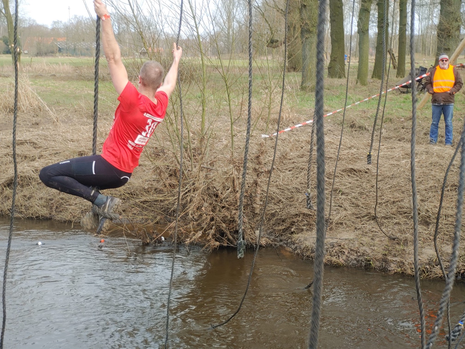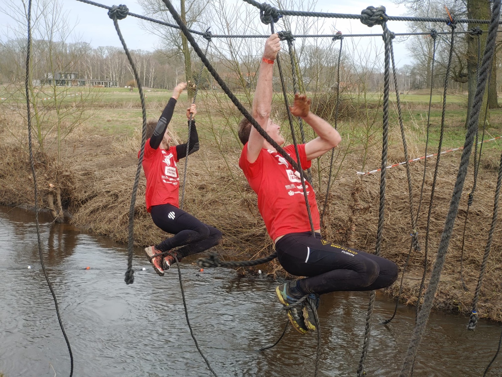 Deelnemers moeten via de lianen naar de overkant van de Dinkel klimmen. Hierbij mogen ze geen gebruik maken van het boventouw.
