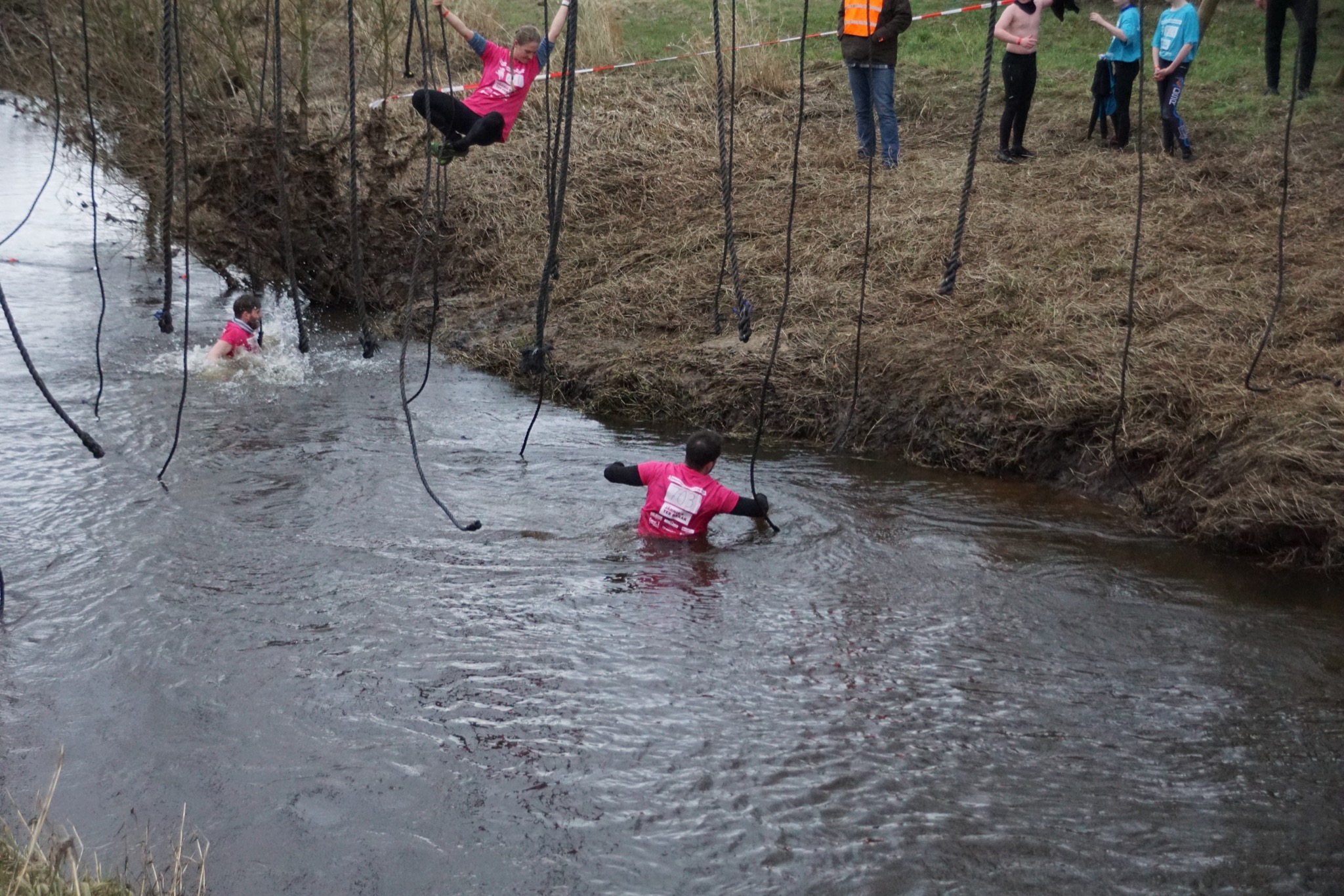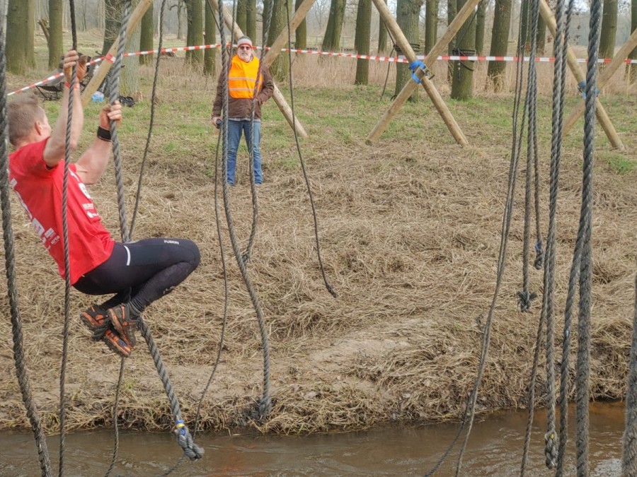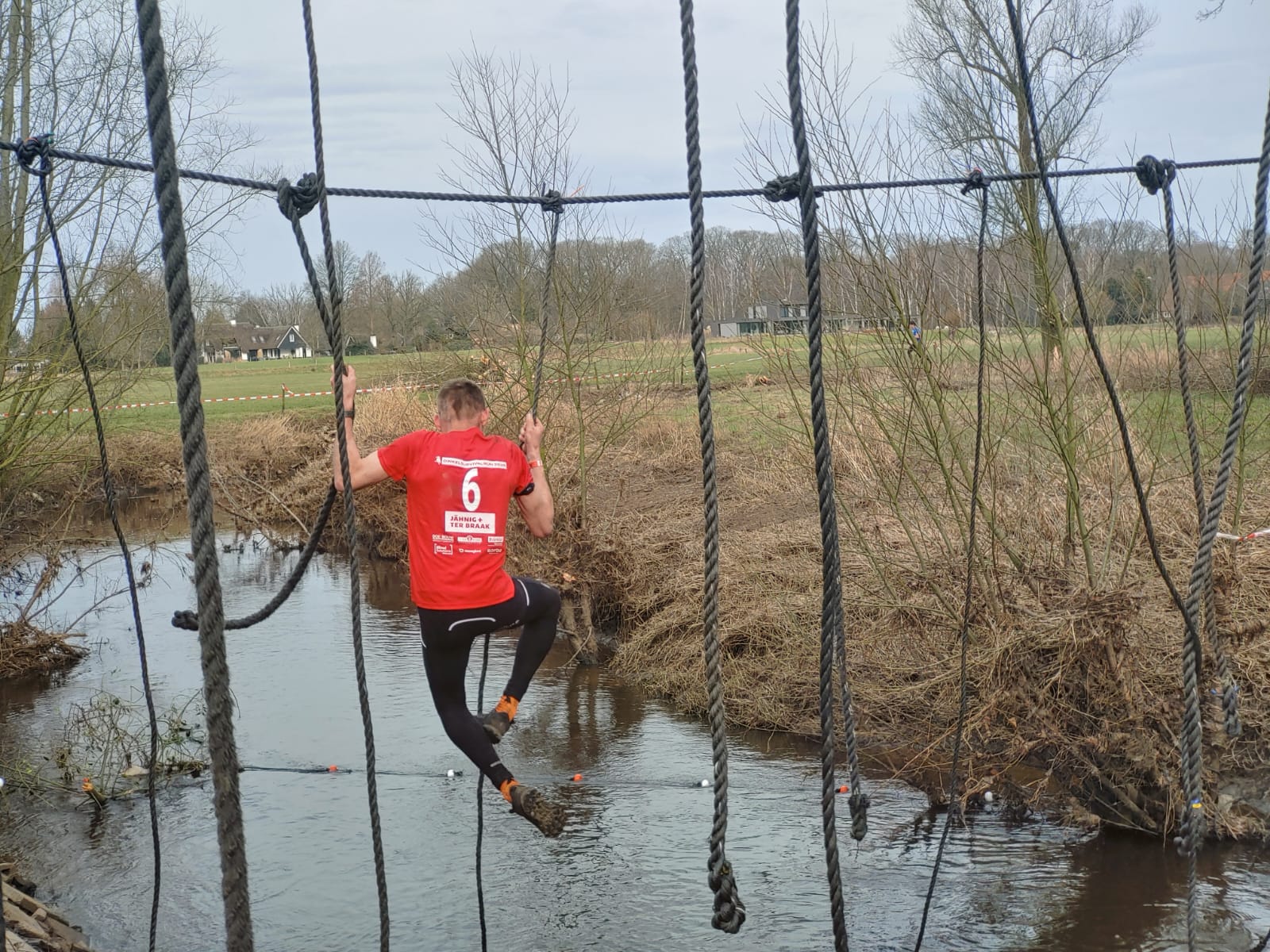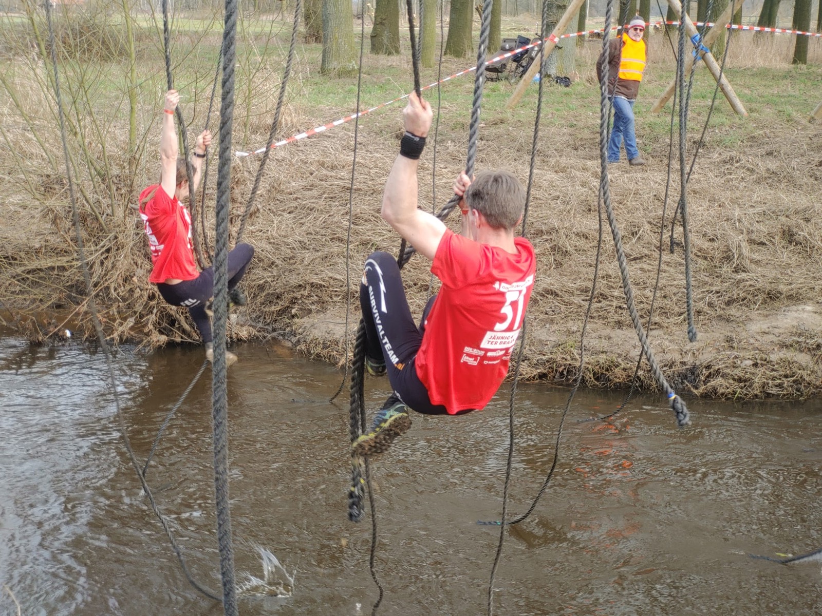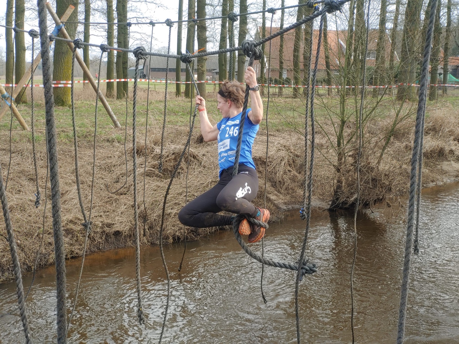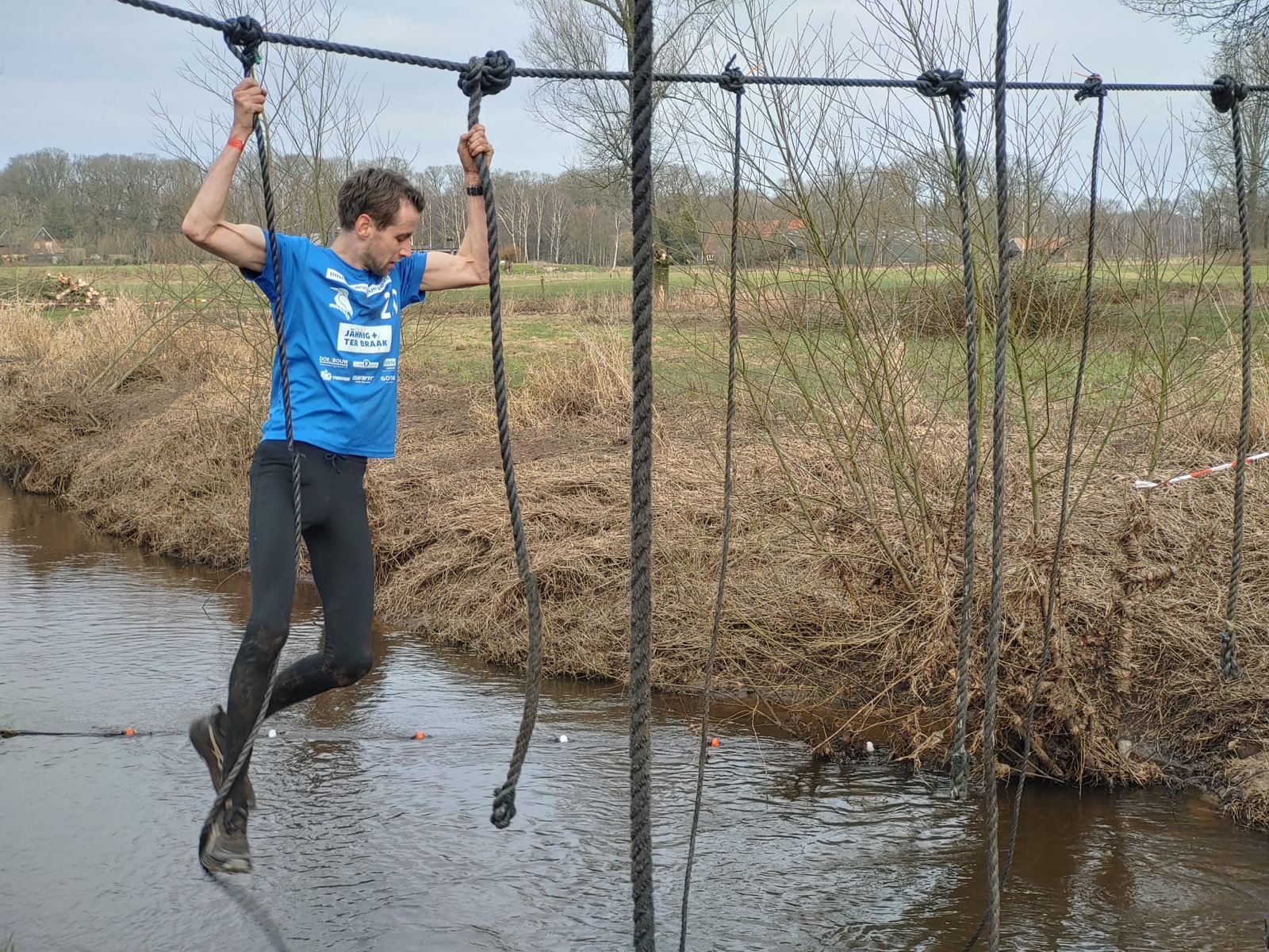 Deelnemers moeten via de lianen naar de overkant van de Dinkel klimmen. Hierbij mogen ze geen gebruik maken van het boventouw.