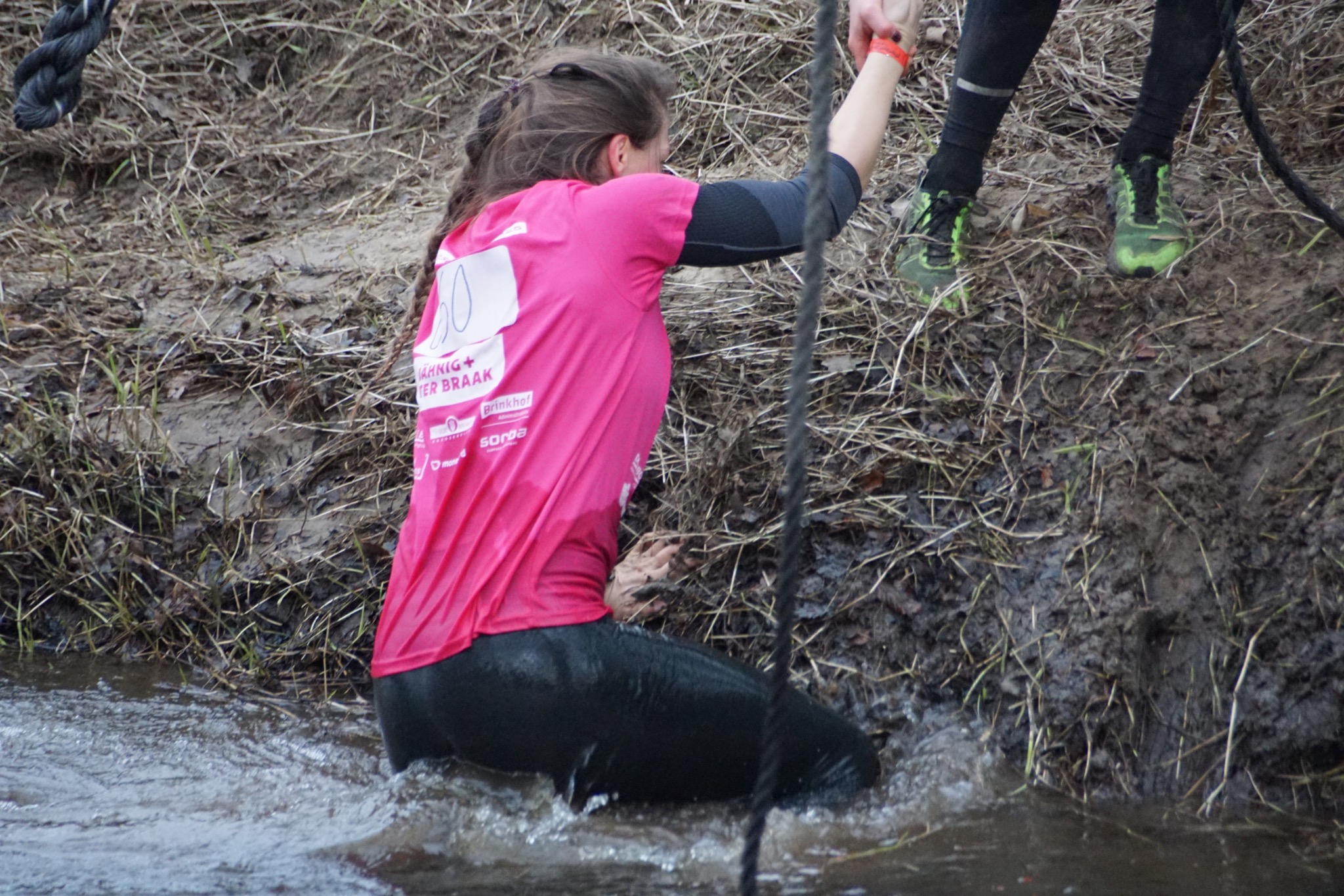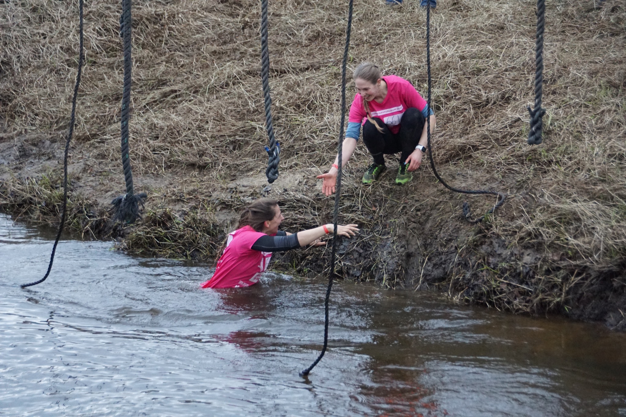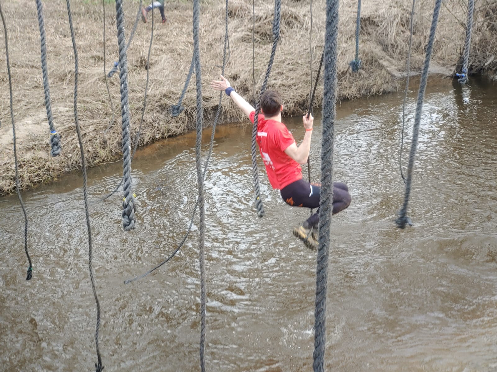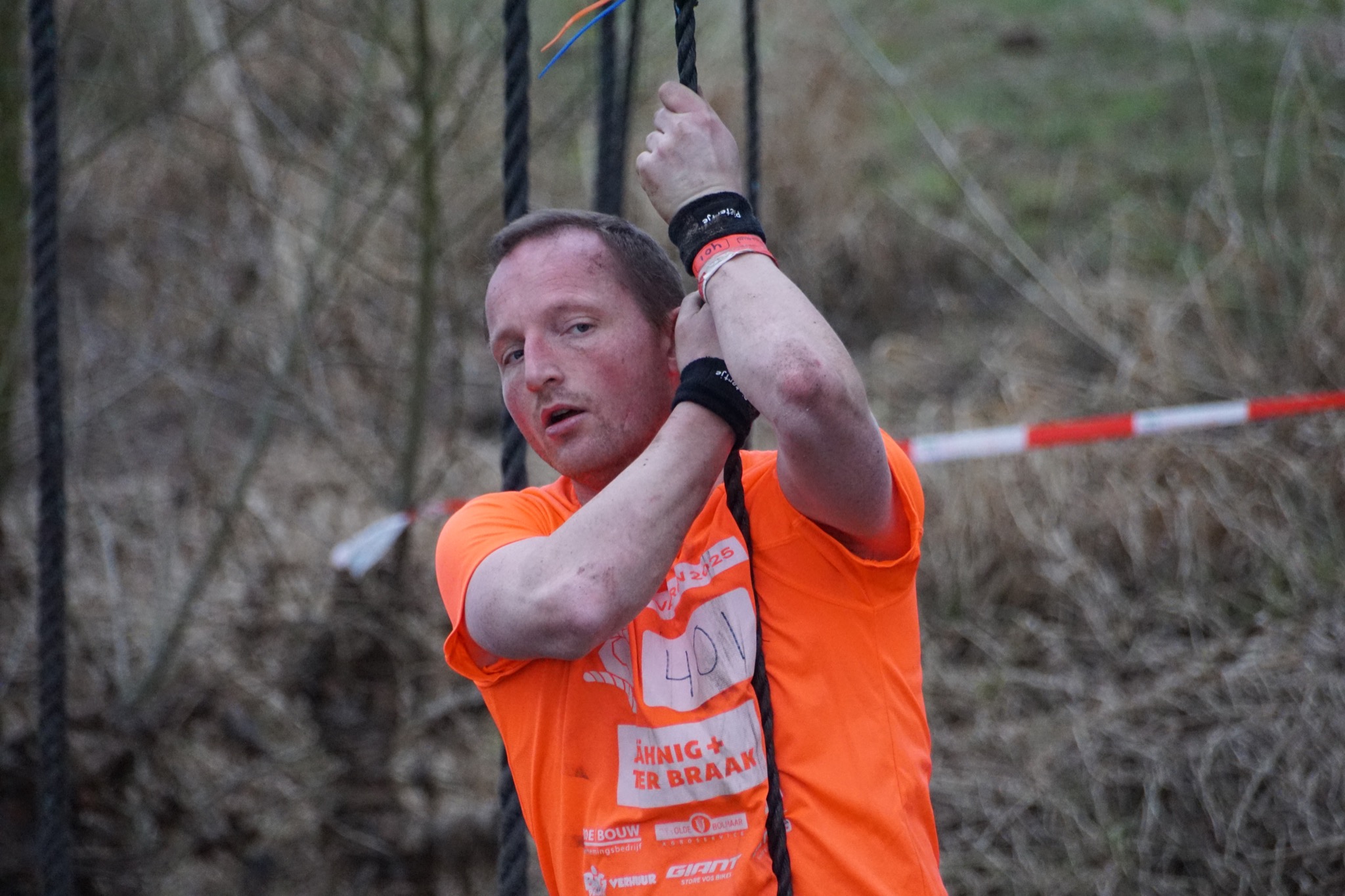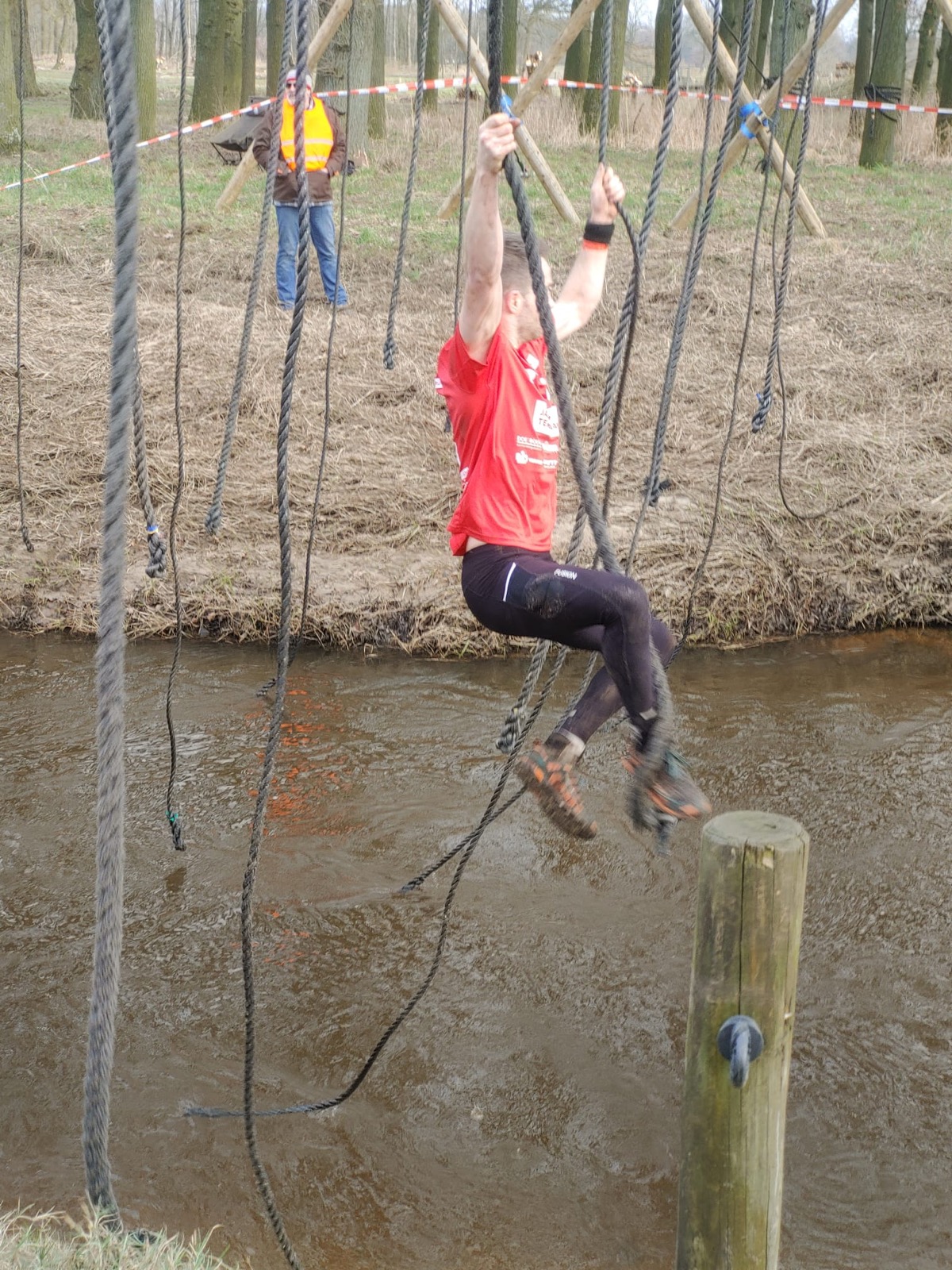 Deelnemers moeten via de lianen naar de overkant van de Dinkel klimmen. Hierbij mogen ze geen gebruik maken van het boventouw.
