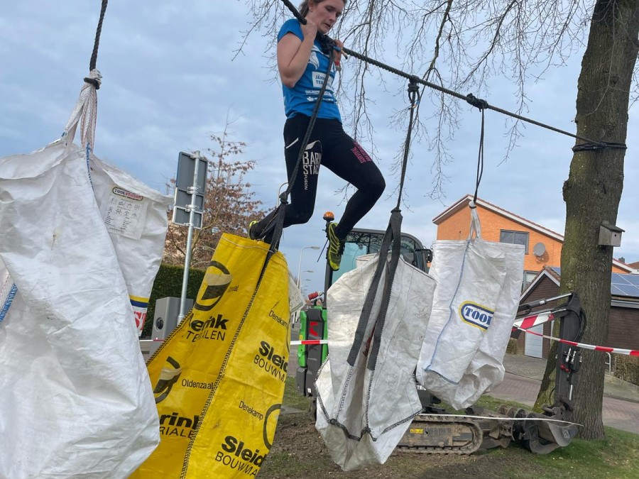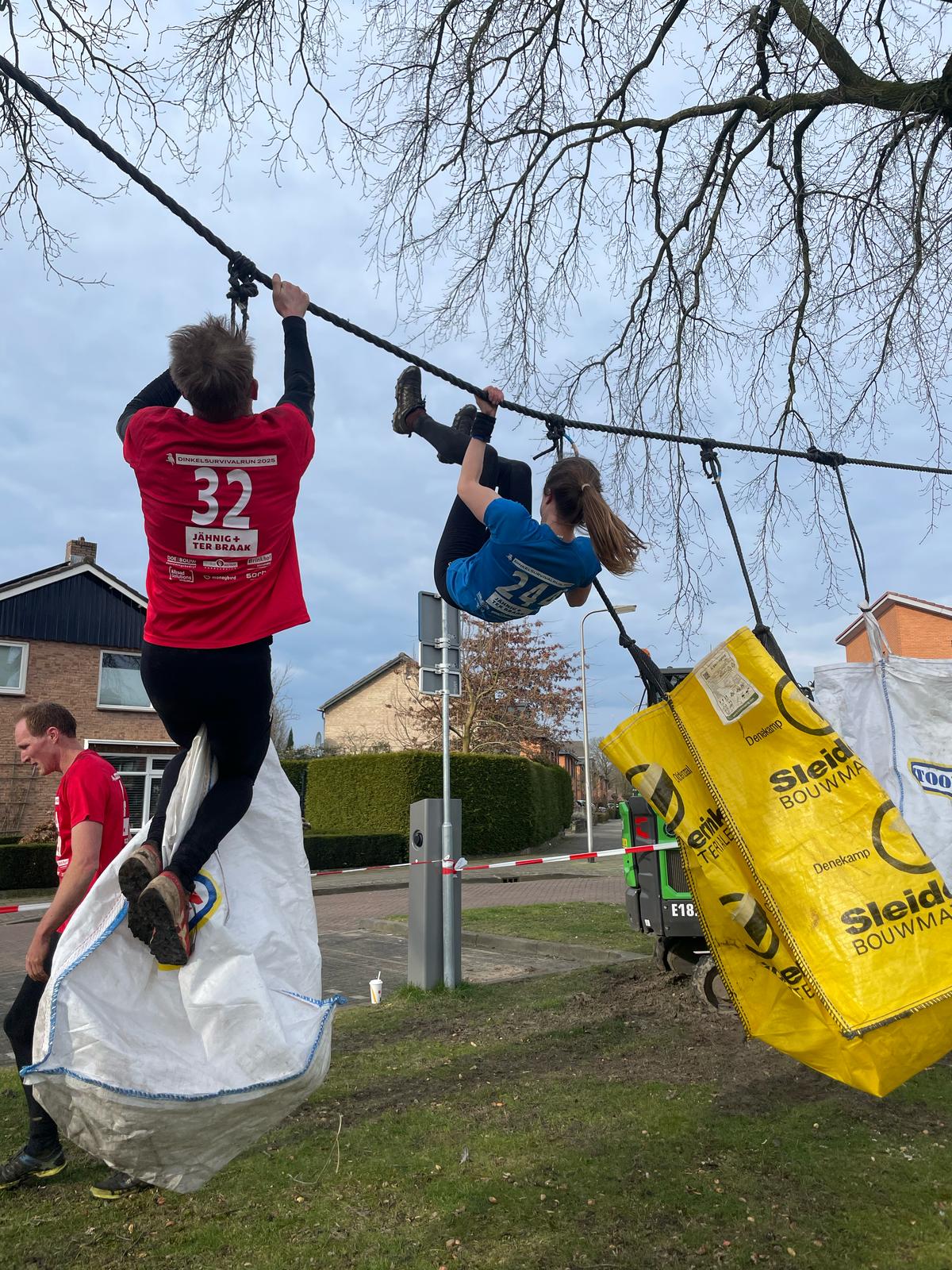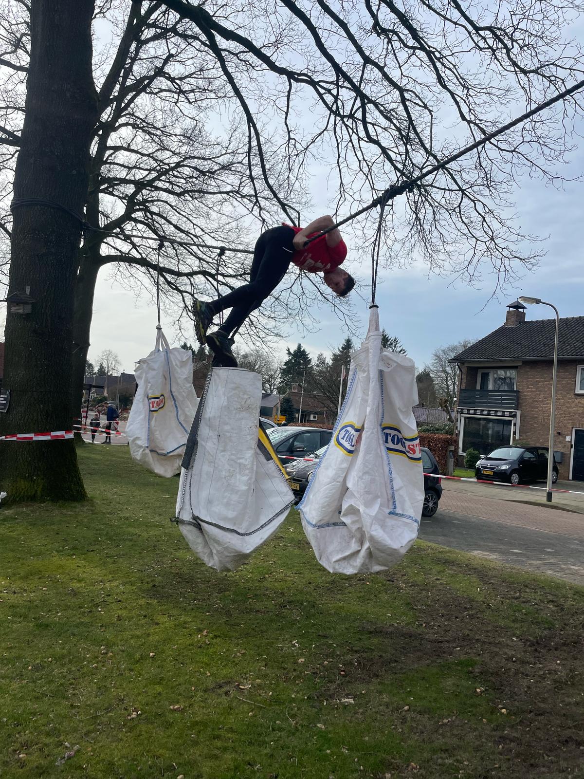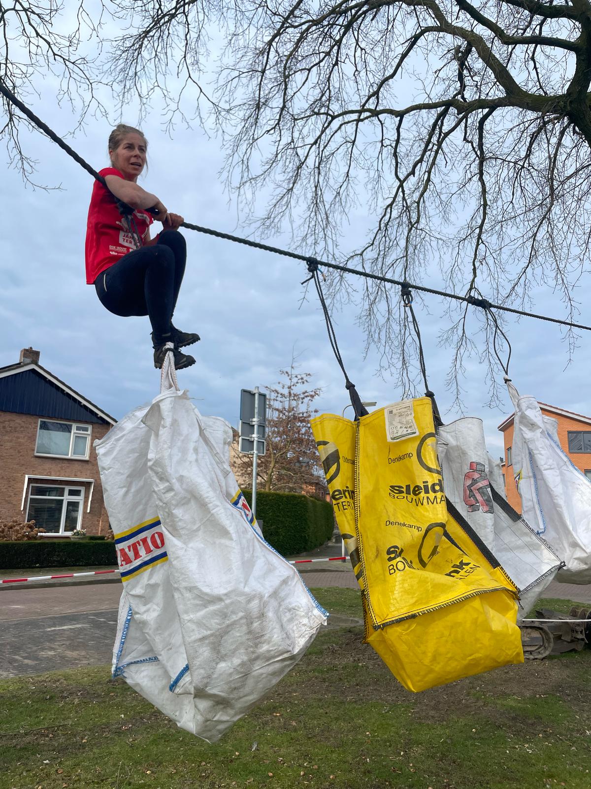 Deelnemers moeten alle drie de verschillende horizontale touwen aantikken. Hierbij mogen ze gebruikmaken van materiaal dat hierin hangt.