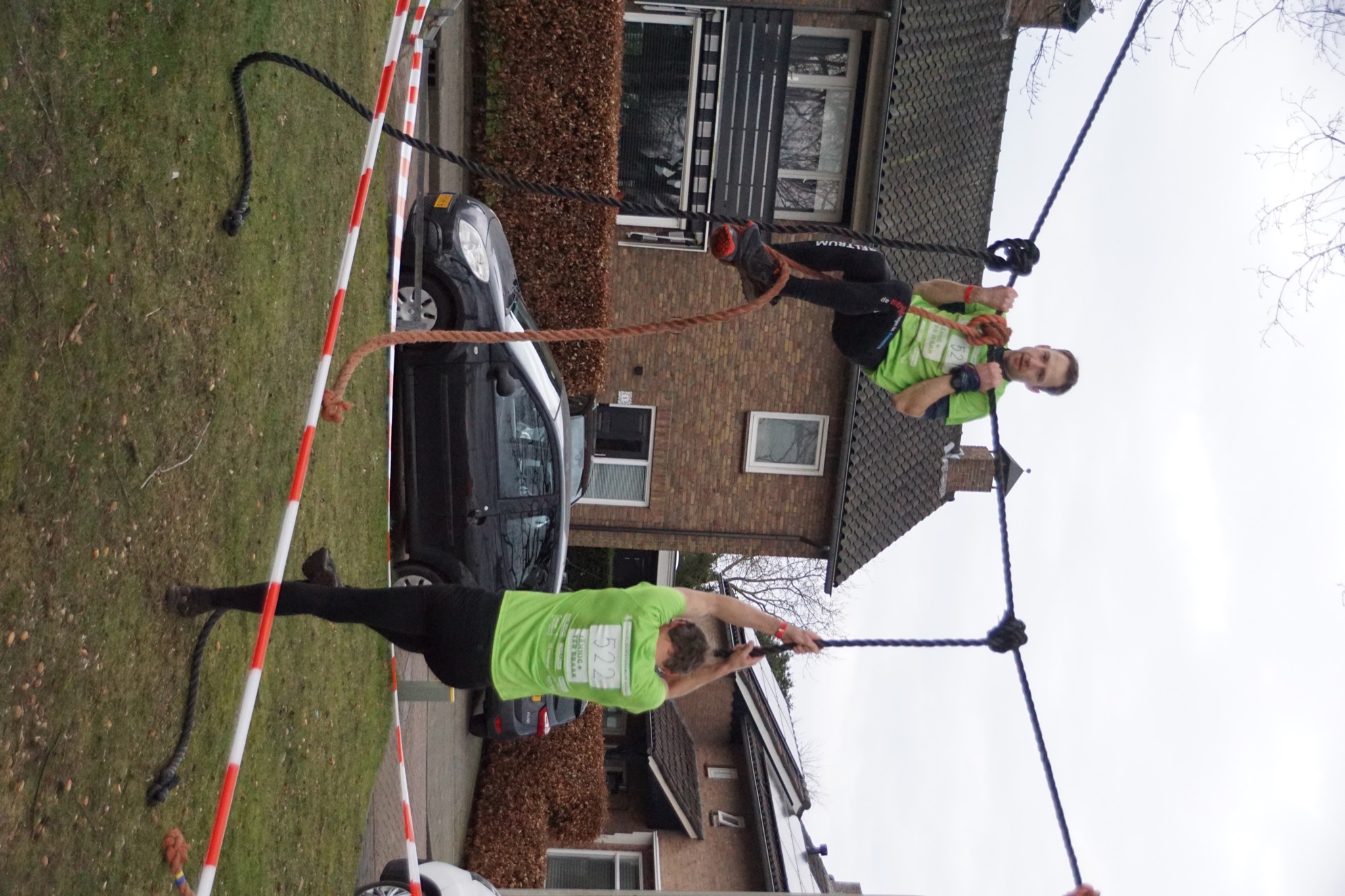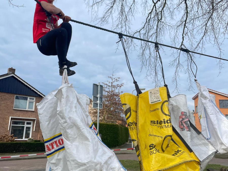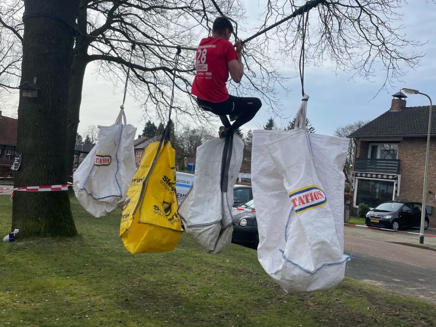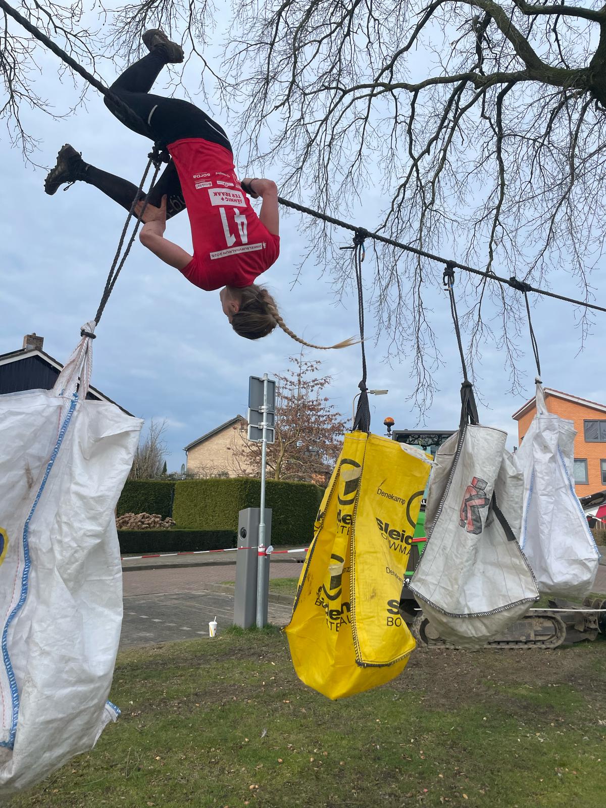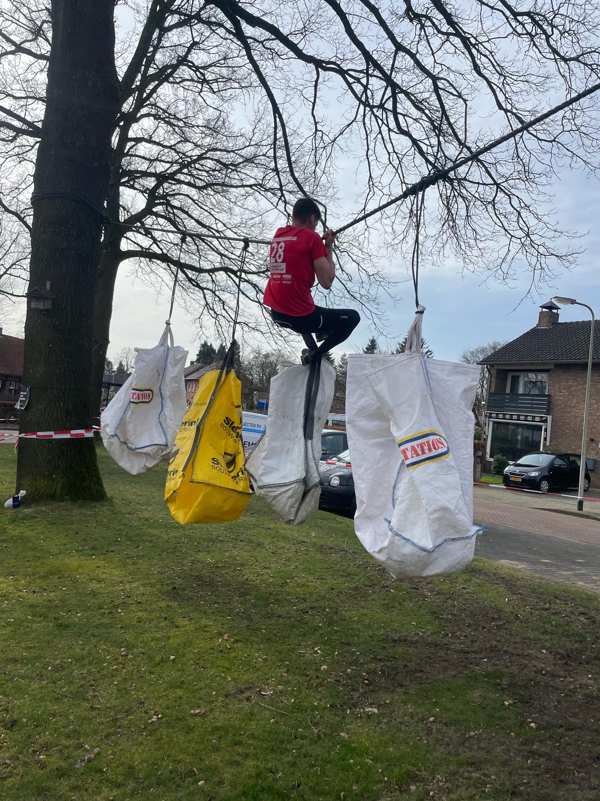 Deelnemers moeten alle drie de verschillende horizontale touwen aantikken. Hierbij mogen ze gebruikmaken van materiaal dat hierin hangt.