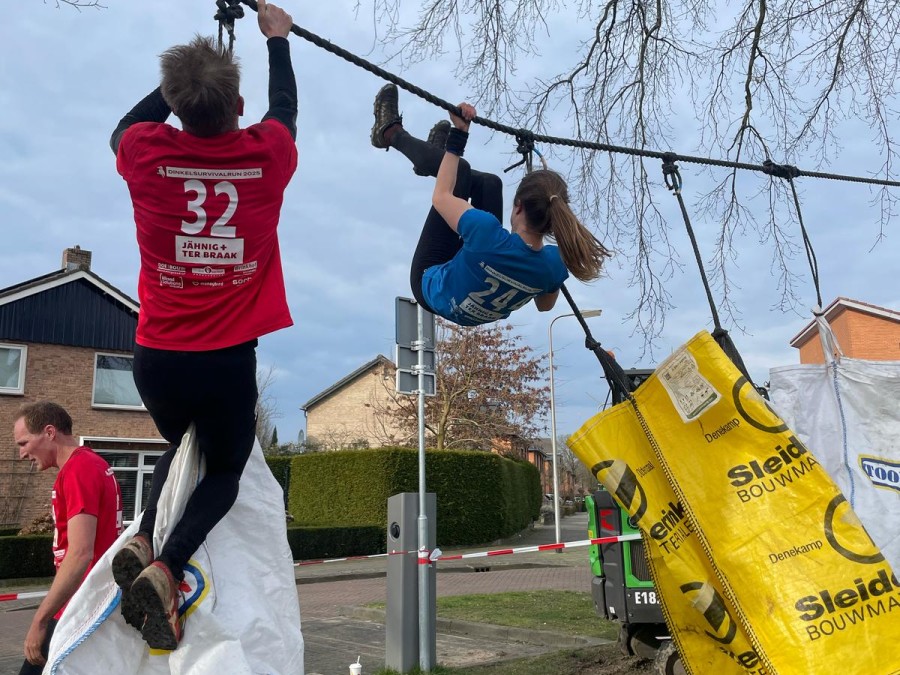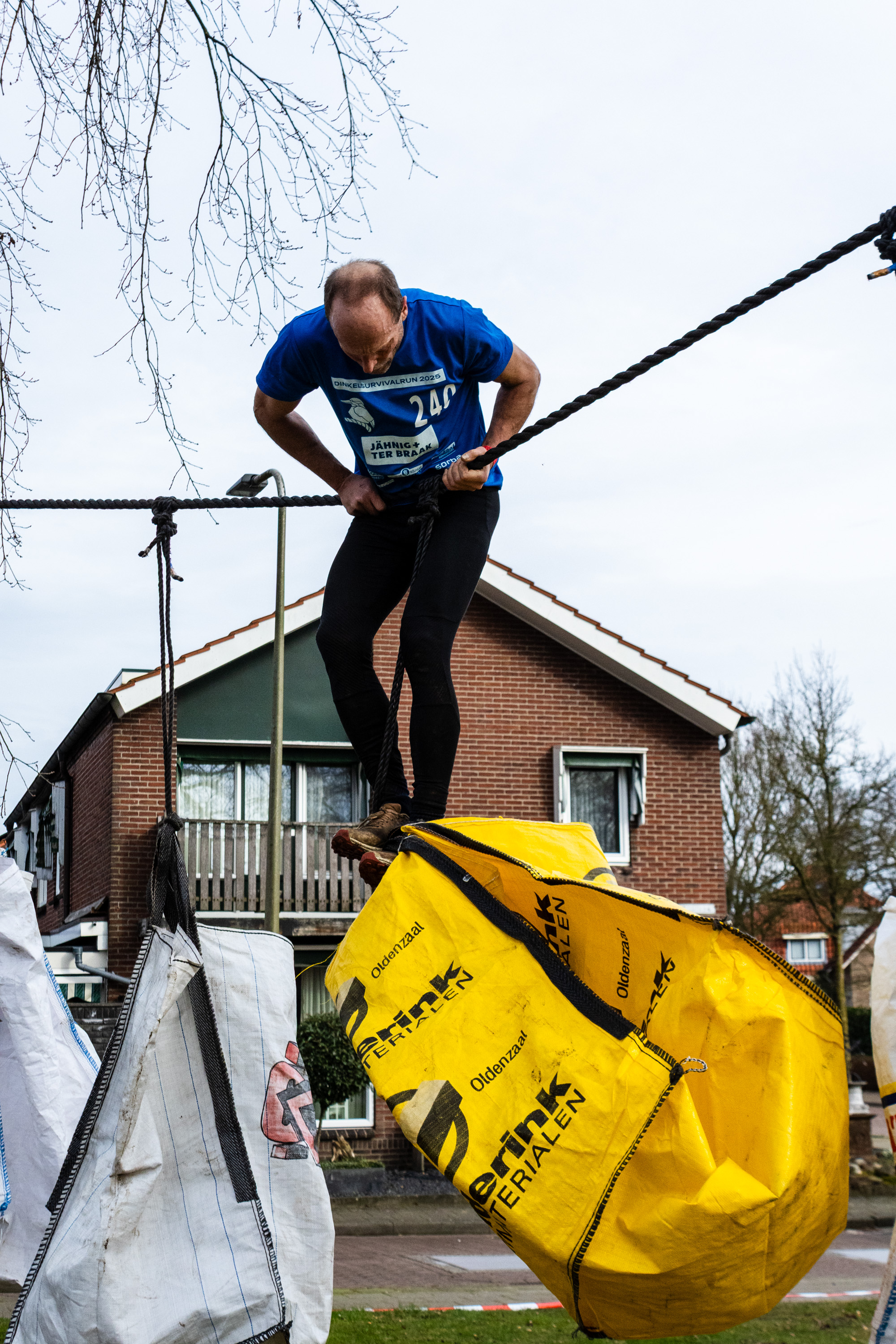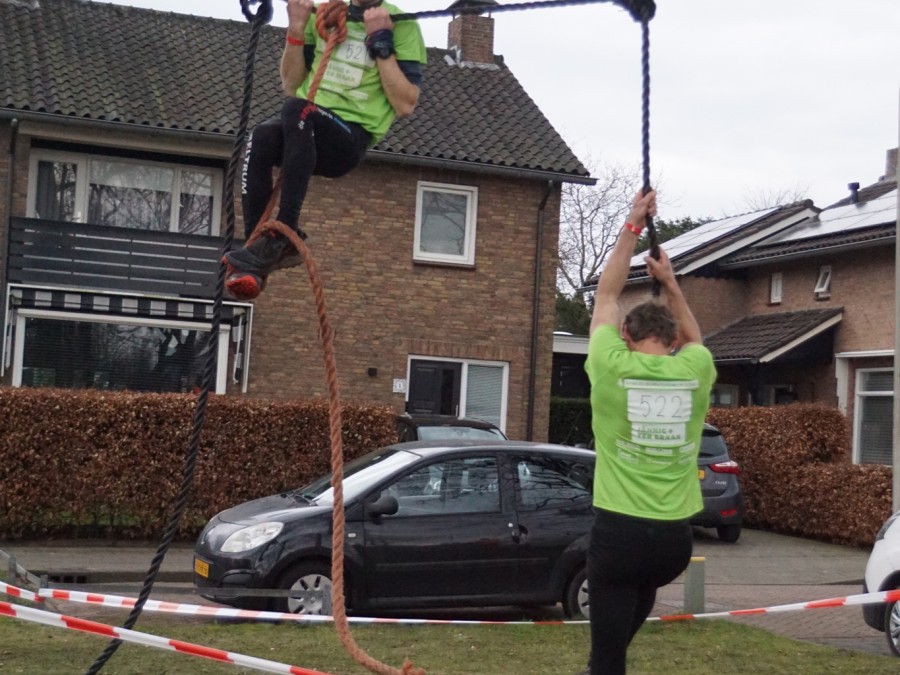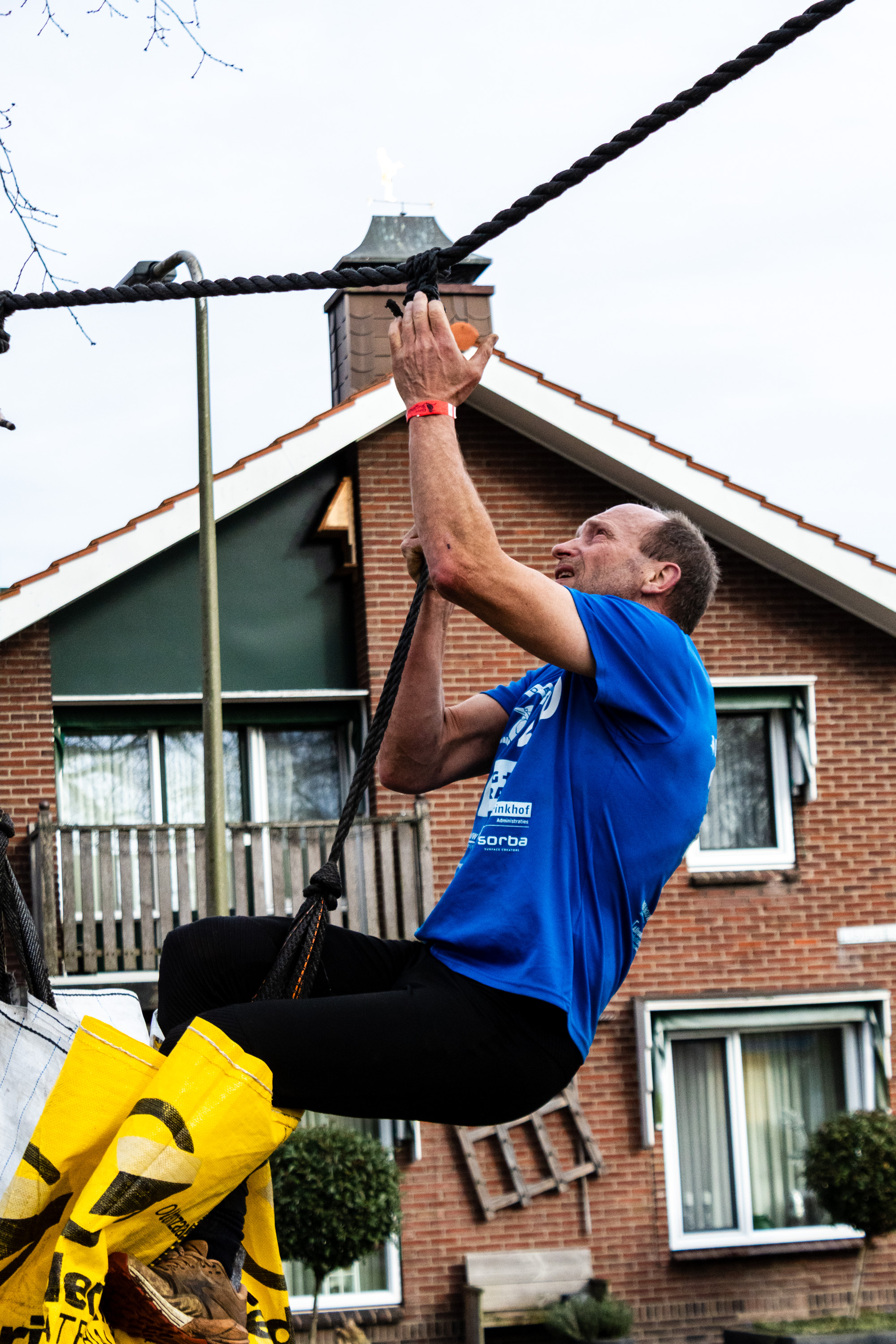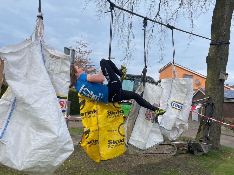 Deelnemers moeten alle drie de verschillende horizontale touwen aantikken. Hierbij mogen ze gebruikmaken van materiaal dat hierin hangt.