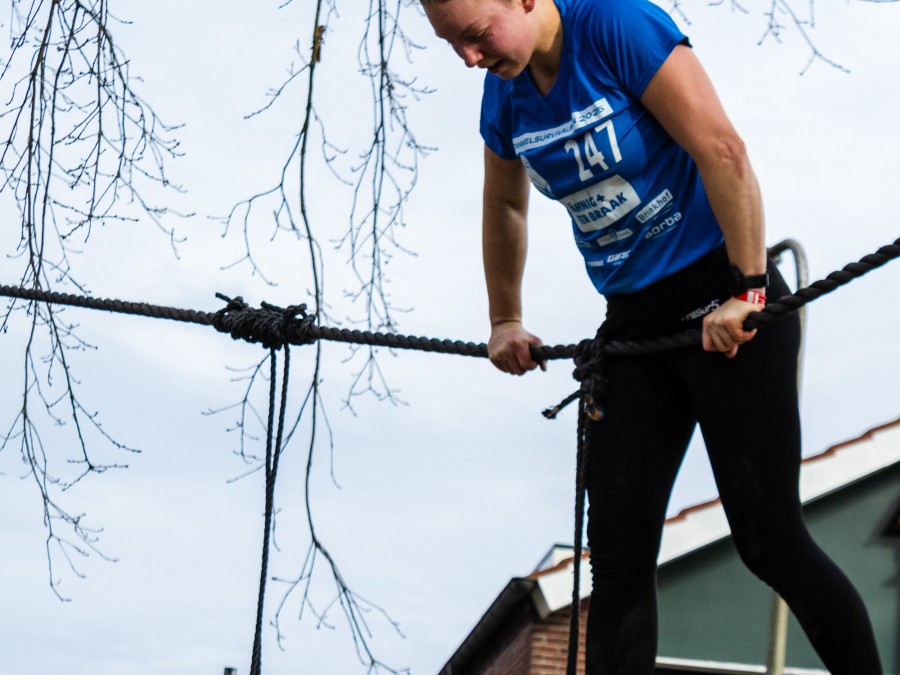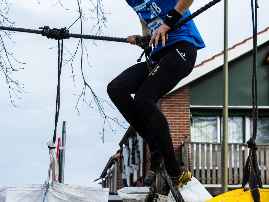 Deelnemers moeten over alle drie de verschillende horizontale touwen heen. Hierbij mogen ze gebruikmaken van materiaal dat hierin hangt. Deelnemers mogen geen borstwaartsom maken.