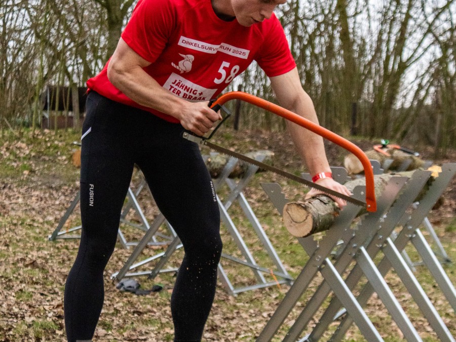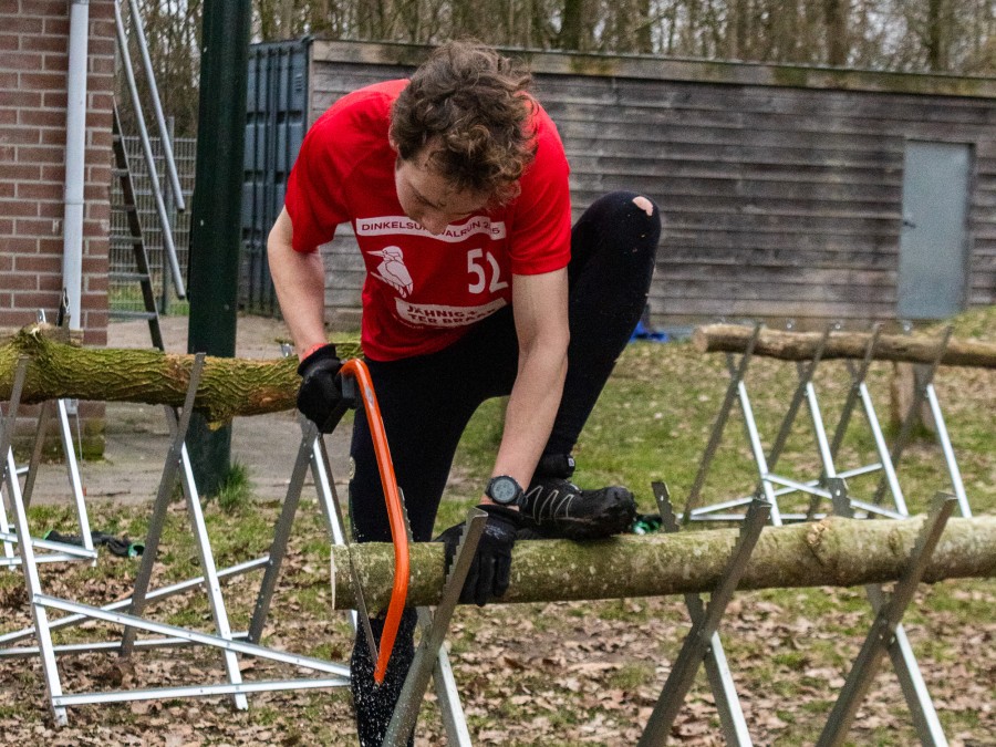 Deelnemer zaagt een plakje van de stam af. Deze moet dun genoeg zijn om door de gleuf op de container te passen. Wanneer dit lukt mag de deelnemer doorlopen.